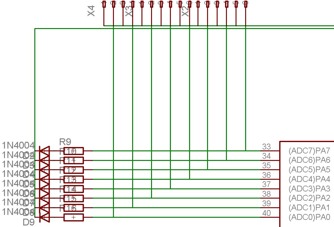 Also als sensoren meine im moment PT100 oder Poti (ein veränderbaren Wiederstand). Mit weglassen ist gemeint: immer 2 Kontakte an x2, x3 ,x4 gehören zusammen. Versorgungsspannung wird über die Leiste rausgegeben durch z.B.PT100 durchgeleitet und dann an den ADC eingang weitergeleitet. Gleichzeitig wird mit jeweils einem Wiederstand ein Spannungsteiler aufgebaut um einen Spannungsteiler aufzubauen (PT100 + Wiederstand). Die Dioden auf meinem Bild werden ja nich benötigt und sind somit durch Brückendraht ersetzt worden und verbinden den Spannungsteiler somit an meine Masse.