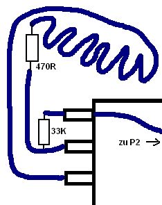 Zur Erklärung des Bildes: Das rechts im Eck ist der Treiber aber der Platine des Motors und die letzten drei Pins davon. Das Blaue sind leitende Verbindungen, das Geschlängel ist die Spule um den Motor herum. Der oberste Pin ist mit dem letzen ungeklären Anschluss P2 verbunden.