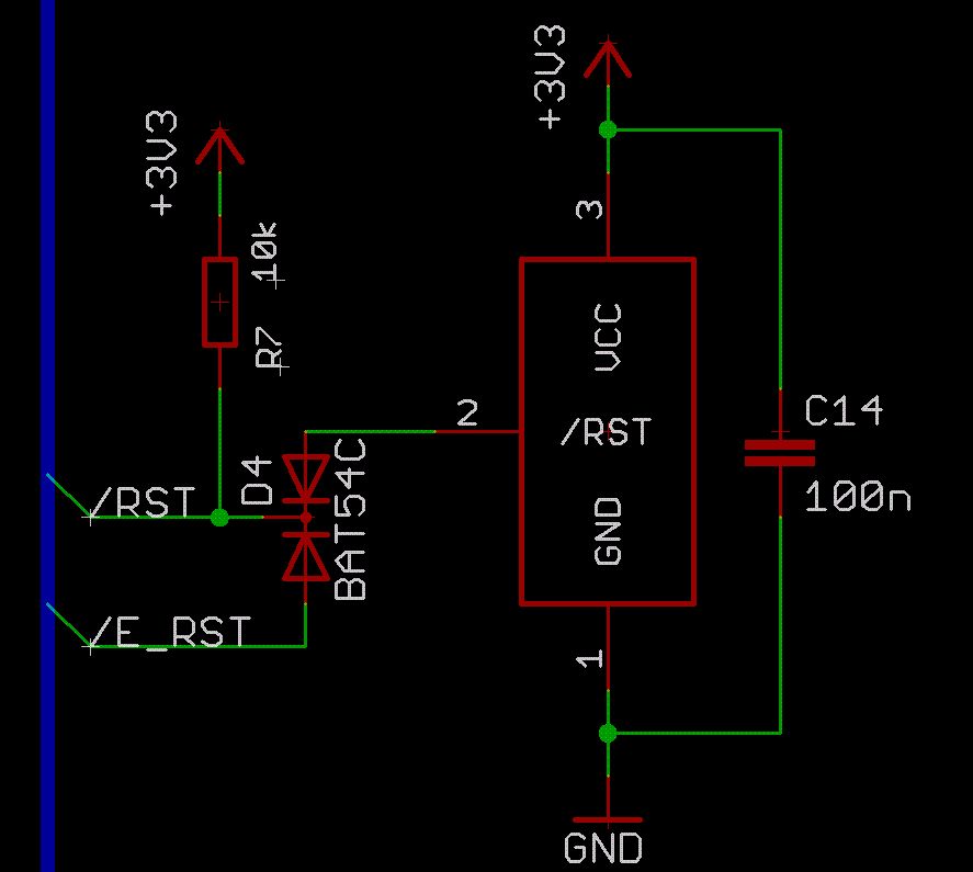 Ich würde mal so sagen, daß die Dioden verpolt sind. Dann siehst Du in das Datenblatt deines uC, bei welcher Spannung am Reset-Eingang dieser auslöst (max. Spannung). Dann siehst Du nach, welche Spannung der Reset-Baustein maximal auf dem Reset-Ausgang ausgibt, addierst die Diodenflußspannung hinzu und mußt unter der Spannung vom Reset-Eingang liegen. Die RS232-Reset-Schaltung kann ich nicht weiter beurteilen, tippe aber mal auf stark negatives Signal, daß Du nur über einen geeigneten Widerstand und die Diode an den Reset-Eingang geben darfst.