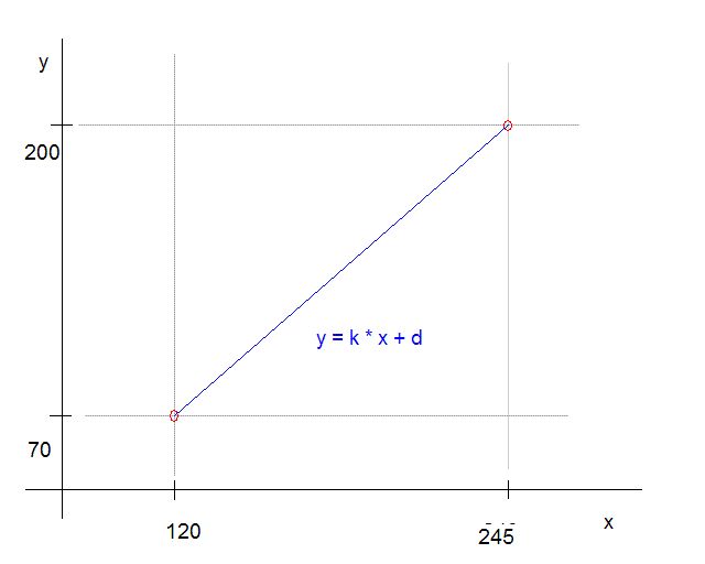 Gehen wirs doch mal mit ein bischen Theorie an: > Zur Zeit habe ich Pulslängen von 120 bis 245 Timer Takten. > > Nun muß ich diese Pulslängen auf die 70-200 Werte anpassen. > Frage: Wie geht das? Du hast also eine Eingangsvariable, nennen wir sie mal x x kann Werte von 120 bis 245 annehmen Aus diesen Eingangswerten willst du Ausgangswerte generieren, die nennen wir mal y und die können sich im Bereich 70 bis 200 bewegen. Da zeichnen wir uns doch gleich mal ein Schaubild, damit das mal etwas übersichtlich zusammengestellt wird: (Siehe beiliegende Grafik) Deine Abbildungsfunktion ist die blaue Gerade. Aus dem Matheunterricht weist du vielleicht noch, dass eine Gerade mit der 'Geradengleichung' y = k * x + d beschrieben werden kann (ist für Computergrafik nicht optimal geeignet, aber für deinen Zweck wirds das tun). x ist der Wert den du von der RC-Auswertung kriegst y ist der Wert den du für die Subtraktion brauchst. Die Frage ist daher: wie gross ist das k und das d, damit die Gleichung eindeutig beschrieben ist. Nun wir kennen 2 Punkte auf der Geraden (die beiden roten Kreise) Für einen x Wert von 120, soll sich ein y Wert von 70 ergeben. Ergo: 70 = k * 120 + d Und für einen x Wert von 245 soll sich ein y Wert von 200 ergeben. Ergo: 200 = k * 245 + d Das macht daher 2 Gleichungen in 2 Unbekannte 70 = k * 120 + d 200 = k * 245 + d das sollte sich doch lösen lassen :-) (Führe ich jetzt nicht konkret aus. Ein lineares Gleichungssystem in 2 Unbekannten zu lösen ist trivial). Es ergibt sich: k = 1.04, d = 54.8 Das ist also deine Umrechnung: Subtraktionswert = RC_Wert * 1.04 - 54.8 Da das k sehr nahe an 1 liegt und das d relativ nahe an 50, ist also die Lösung von Michael gar nicht so schlecht. Ansonsten besteht die weitere Kunst jetzt darin, aus den Fliesskommazahlen ganze Zahlen zu machen, damit für die Berechnung nicht unbedingt Fliesskommaarithmetik gebraucht wird. Eine (simple) Möglichkeit ist es, einfach alles mal 100 zu nehmen. 1.04 -> 104, 54.8 -> 5480. Das Ergebnis, das du erhältst ist dann allerdings auch mal 100. Du kriegst daher nicht 70 raus sondern 7000. Das sollte aber weiter kein Problem sein, man kann ja noch doch 100 dividieren. Schlauer agiert man allerdings, wenn man nicht einen Faktor von 100 nimmt, sondern eine 2-er Potenz. Denn dann wird die abschliessende Division für den µC trivial. Aber das überlasse ich dir zur Übung: Eine 2-er Potenz zu finden, sodass aus 1.04 und 54.8 möglichst ganze Zahlen werden. Im schlimmsten Fall probierst du einfach durch. Soviele 2-er Potenzen in einem vernünftigen Bereich gibt es ja nicht ( 2, 4, 8, 16, 32, 64, 128, 256 )