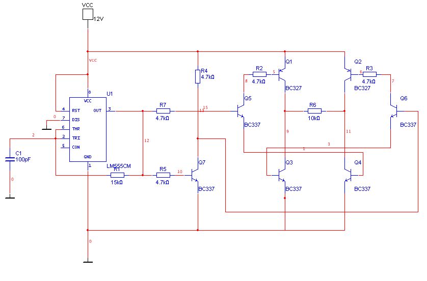 Hi, ich möchte mir einen Wechselrichter für einen Trafo mit Luftspulen bauen (zu drahtlosen Energieübertragung). Die Spulen haben jeweils nur ca. 5 Windungen und ca. 30mm Durchmesser, sind aber in Material eingebettet (denke mal irgendein Ferrit) und sehr nahe aneinander ca. 1mm Abstand. Auf der einen Seite stehen 12V zur Verfügung, auf der Anderen Seite sollten ca. 150mA bei einer Spannung von mind. 6 Volt rauskommen (auf der anderen Seite sitzt ein µC). Ich hab mir da mal was aus Transistoren zusammengebastelt, funktioniert aber nur bis ca. 4kHz (wird wohl zu wenig sein). Wie könnte ich das besser lösen? MfG, Johannes