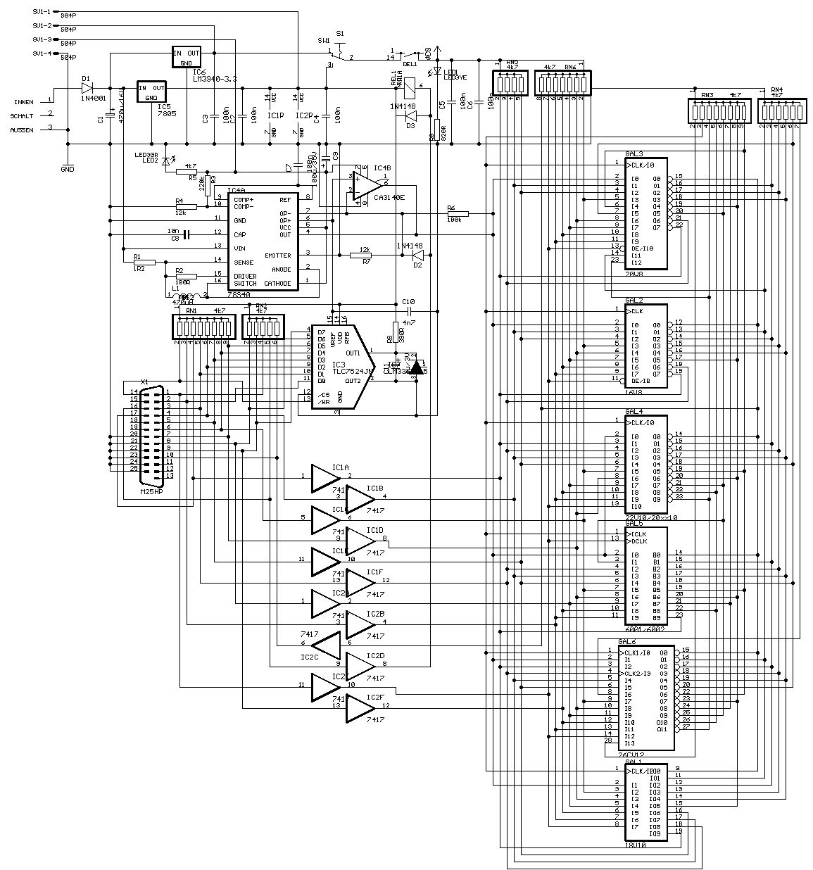 Habe den Galblast vor ca. 1 1/2 Jahren gebastelt - die einwandfreie Funktion der Schaltung an sich kann ich bestätigen. Allerdings hatte ich die Schaltung ohne Step-Up aufgebaut, sondern habe - wie auf der Seite beschrieben - einen Trafo mit entsprechend hoher Spannung genommen (und alle kleinen Spannungen längs-runtergeregelt). Da die Software sehr betagt ist, mußte ich auf einen K6-2 @ 400MHz zurückgreifen - da lief es (unter Windows 95 ohne jegliche Zusatzsoftware). Was meinst Du mit >Bei der Fehlersuche ist mir aufgefallen das die Pin-Beschriftung auf der >Sub-D Buchse nicht mit den Pins auf dem Schaltplan übereinstimmen ?? Ich bin so vorgegangen: Schaltung sagt "Y an Pin X", also an der SubD-Buchse Pin X rausgesucht (nach Beschriftung), und an diesen halt Y gelötet. Habe sogar gerade nochmal nachgeschaut: Pins 20-25 an der Buchse liegen auf Masse. Viel Glück bei der Fehlersuche !