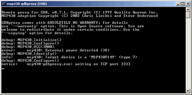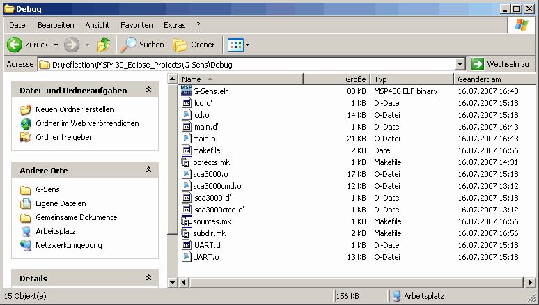 Salu zusammen Ich habe endlich den mspgcc zum funktionieren bekommen. Er zeigt folgendes an (Anhang) Was bedeutet dieser Error? Ich weiss selber das ich den MSP speise, speise ich ihn nicht, erkennt er ihn ja nicht... Im zweiten Post seht ihr noch die Programmstruktur unter Debug. Gehe ich in Eclipse auf Debug, kommt die Fehlermeldung: D:\reflection\msp430_Eclipse_Project\G-Sens\Debug\G-Sens not found D:\reflection\msp430_Eclipse_Project\G-Sens\Debug\G-Sens not found D:\reflection\msp430_Eclipse_Project\G-Sens\Debug\G-Sens not found aber das File scheint ja da zu sein...?? (siehe Anhang im nächsten Post) Ich will eigentlich nur das Prog auf den MSP laden, debuggen ist mir vorerst noch egal, bin schon froh wenn ich das Teil irgendwie rauf kriege. Hoffe es kann mir einer helfen, obschon, ob mir noch zu helfen ist...?? :o) Greets und Danke schon einmal im Voraus reflection