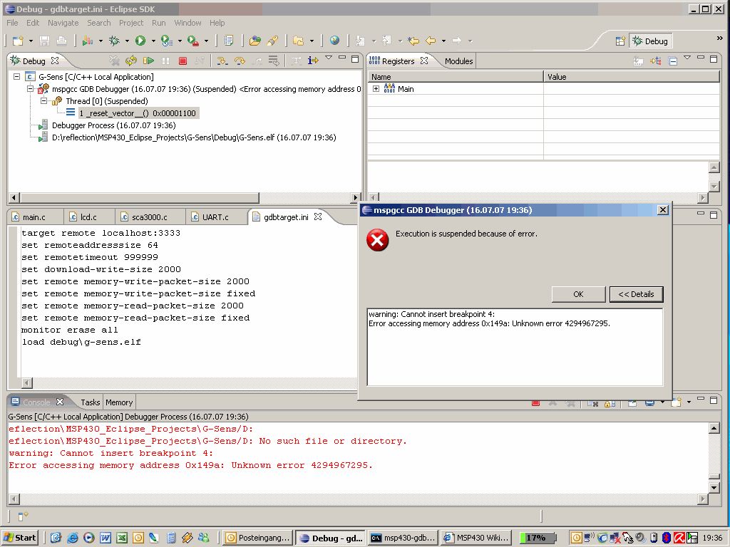Salu zusammen so, ich komme nun in den Debug Modus, er scheint einen Teil herunter zu laden, aber bei 85% steigt er immer mit folgender Fehlermeldung aus (Anhang). Wenn ich den MSP dann kurz vom Strom nehme und wieder neu starte, ist ein Teil des Programms drauf. Ich kann alle Zeichen auf dem Display lesen, nur meine Umwandlungen mit sprintf hat er nicht geschluckt, da kommt nur Müll (hat in IAR so funktioniert der Code...) . Kann mir aber das aus dieser Fehlermeldung nicht erklären. Habe irgendwo mal was gelesen, dass es verschiedene Versionen von msp430-gdb.exe gibt. Stimmt das? Kennt jemand das Problem. Irgendwas hat er auch noch mit einem Reset Vector (hinten im Bild) Greets