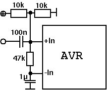Hi. Noch eine Lösung, nur mit einem AVR: Hardware (siehe gif): - Analogsignal über C an Spannungsteiler 2*10k auf halbes VCC ziehen. - Spannungsteiler an positiven Eingang. - Spannungsteiler über längeres RC-Glied an negativen Eingang. Effekt: Analog Comparator Interrupt bei jeder positiven Halbwelle. Software: - Timer-Vorteiler so einstellen, dass der niedrigste Ton gerade nicht den Timer zum Überlaufen bringt und der höchste Ton wenigstens einige Zählschritte hat. (8-Bit-Timer: <255, 16-Bit-Timer: <65535). - Beim Analog-Comparator-Int den Timer auslesen und auf Null setzen. - Ausgelesenen Timer-Wert mit Wert in einer Tabelle vergleichen und entsprechendes Resultat ausgeben. - Erfolgt ein Timer-Überlauf-Interrupt, dann liegt kein Ton an. Viel Erfolg beim Ausprobieren. MfG Gerd