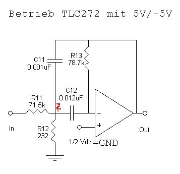 Hallo Leute, habe mir mit einen Bandpass-Programm diesen Bandpass erstellen lassen und auch mal Testweise aufgebaut. Nur auf Out sind immer 3,88V - der OPV schaltet also immer voll durch. Was mache ich falsch? Ich bin mir nicht sicher, ob R11 und R12 mit einander verbunden sind, aber egal ob sie es sind oder nicht, an den 3,88V am Ausgang ändert sich nichts. Habe den Aufbau kontrolliert, nichts schwingt, alles fein mit einander verbunden, auch habe ich den OPV schon mehrfach gewechselt. Das Piezo-Element funktioniert auch aber mein Oszi bleibt auf den 3,88V egal wie ich auf dem Element rumtrommle. Wer kann mir da freundlicherweise helfen?