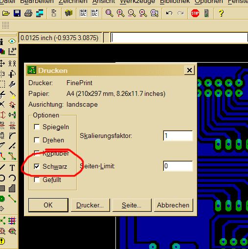 Ich machs immer so: Mit Eagle die *.brd öffnen. Mit den Layer Einstellungen alles was nicht Kupfer ist wegschalten. (Layer 21 ausschalten, Eagle schaltet dann auch den Rest weg) Danach das GND Polygon neu generieren lassen: Menuepunkt "Werkzeuge" - "Luftlinien neu berechnen" Und dann drucke ich das einfach aus: Bei den Druckoptionen ist "Schwarz" angehakt, alles andere ist bei mir ausgeschaltet.