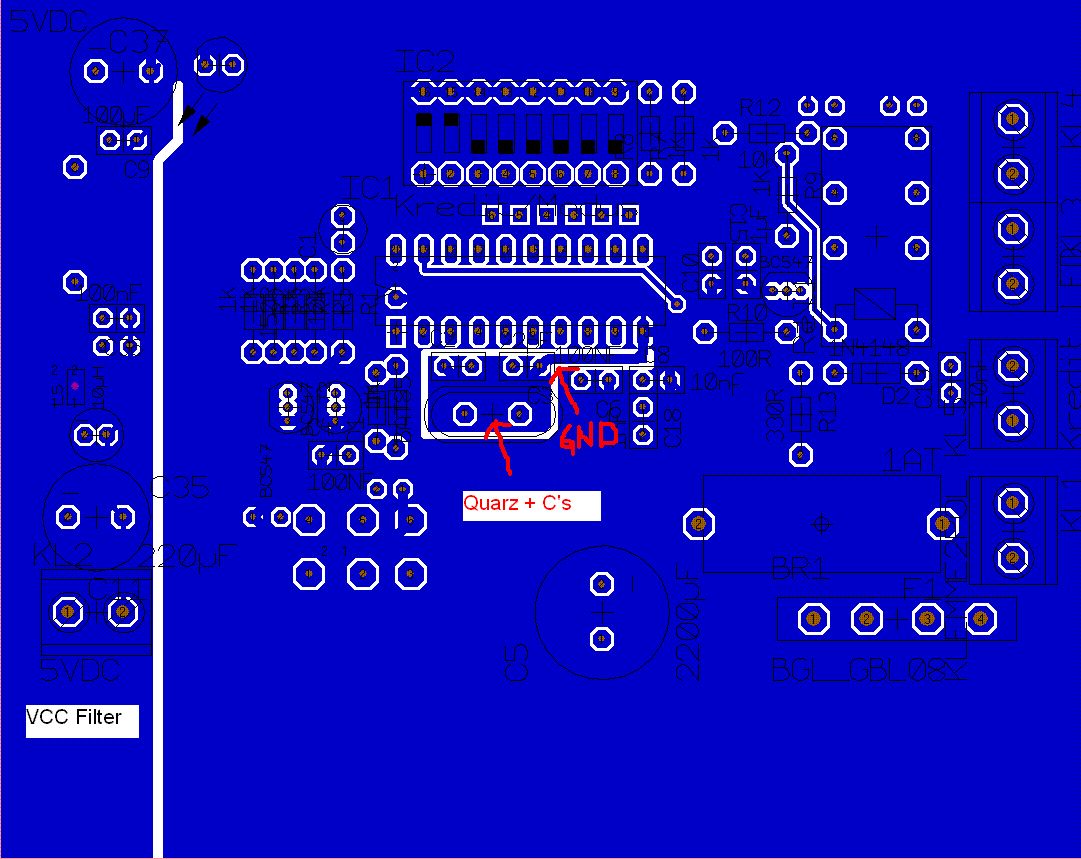 Hallo, Mal ne kurze Frage an die Layoutspezialisten: Bin gerade dabei eine Schaltung zu layouten. Hab zwar hin&wieder mal was gelayoutet aber meist halt ohne Rücksicht auf EMV bzw. Störausbreitung, getrennte Masseflächen etc. Hab nun eine Schaltung welche ich "störsicherer" machen möchte. Dazu am Eingang ein VCC Filter (siehe Beitrag "Lange Leitung am µC- Port und Filter Frage") bei dem ich die Filtermasse mit der restlichen Masse durch einen Schlitz trenne und nur oben wo das VCC bzw. GND sauberer sein sollte, verbinde. Des weiteren habe ich den Quarz Bereich mit seinen 2 Kondis wiederum mittels Trenngraben von der restlichen Masse getrennt und mittels separater GND Leitung mit der µC-Masse verbunden. Der Rest(Blau) ist alles Massefläche. Ist das nun eine gute Idee mit den Trenngräben praxistauglich oder zu vergessen? Hab ich mal in einer Applik. von Atmel gesehen. Bin für jeden Tipp dankbar. mfg Manfred