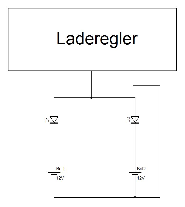 Folgendes Problem: 2 (baugleiche) Akkus soll man bekanntlich ja nicht einfach parallel zusammenhängen zum Laden und Entladen, da sie sich sonst gegenseitig ebenfalls entladen. Nun wird im Wohnwagen- und Schiffswesen da am einfachsten mit 2 Dioden ausgeholfen (siehe meine Skizze). Die Dioden verhindern, dass sich die Akkus gegenseitig entladen. Bei meinem Projekt handelt es sich um eine solarbetriebenen Lüftung, sprich ein Laderegler, versorgt durch ein Solarpanel, lädt die Akkus und stellt gleichzeitig die Lastversorgung sicher. Zur Kapazitätsverdopplung will ich nun die Akkus parallel hängen, doch der Laderegler sollte die Akkus mit den gleichen Anschlussleitungen laden wie entladen, was aber aufgrund der Dioden kaum möglich sein wird, oder?? Anders: Wie kann ich die volle Kapazität von beiden Akkus direkt von den Akkus abgreifen?? Thx