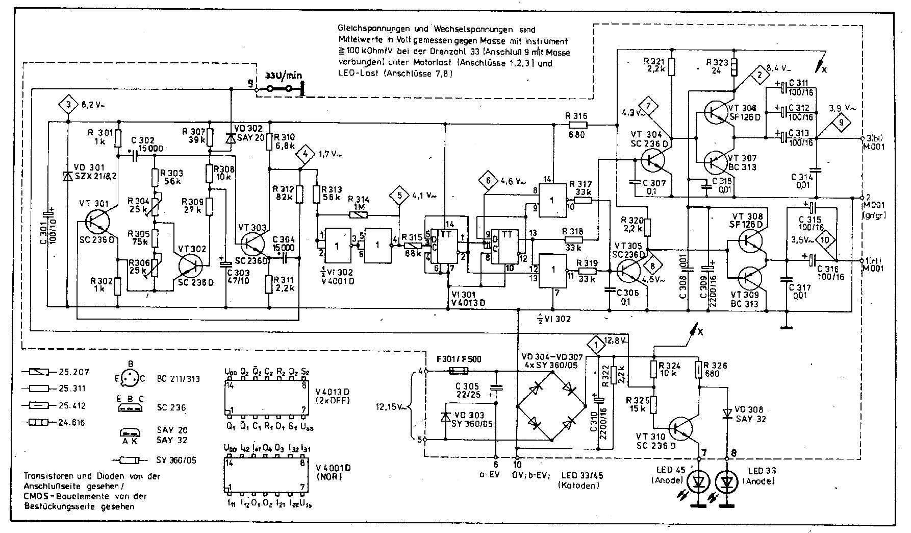 Michael Waiblinger wrote: > Cool, das ist genau die Kurvenform die ich auch verwende > (sin(0..120°)und zurück), "Umgeschaltet" wird nach jeweis 60°. Verwendest du eine Kommutierung oder machst du das nach eine bestimmten Zeit ? > Wo bekommt man den am einfachsten für den Hausgebrauch > Asynchronmaschinen her? Gute Frage. Meine habe ich aus einer alten Laborzentrifuge. Der Motor ist mit 12000UpM bei 300Hz angegeben. Ansonsten noch aus Waschmaschinen, die laufen aber langsam (ich glaube so 600UpM), haben dafür ein höheres Drehmoment. Und es sind echte Asynchronmotoren für 230V Strangspannung. Nahezu alle anderen Motoren sind keine echten 3 Phasenmotoren, sonder es sind Kondensatormotoren mit nur 2 Wicklungen die eine um 90° verschobene Spannung benötigen. > [edit: Ach ja nochwas,wie bilde ich den am einfachsten künstlich den > Sternmittelbunkt nach? Einfach drei Widerstände Sternverschaltet, oder > drei Spulen, oder wie? Einfach mit 3 Widerständen. Das ist zwar nicht ganz so gut wie der orginale, funktioniert aber einigermaßen. Im Anhang mal meine Schaltung zur HDD Motoransteuerung: Hat nicht viel Leistung, ist ungeregelt, dreht eine HDD aber fast so schnell wie orginal. Ich verwende das ganze für eine HDD als Dekoobjekt, bei der ich den Deckel entfernt habe und eine Plexiglasplatte stattdessen eingesetzt habe. Beim Starten arbeiten die Transistoren im linearen Bereich und begrenzen jeweils auf etwa 200-300mA. Sobald das ganze einmal läuft werden die Transistoren kaum noch warm.