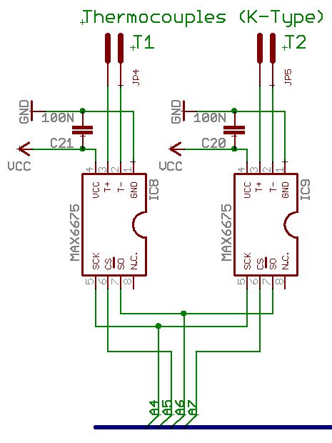 > Datenblatt lesen. Da steht drin, wie gross der maximale Strom an einem Pin sein darf. Maximal 50mA am SO-Pin. Wie kommen ich von diesem Wert zur Antwort auf die Frage nach der R.I.P.-Wahrscheinlichkeit? http://datasheets.maxim-ic.com/en/ds/MAX6675.pdf > Aber was spricht denn dagegen, in beide MISO-Leitungen einen Widerstand von z.B. 1k zu hängen? Der Platz (die beiden ICs wurden nachträglich in eine Platine eingefügt, an einer Stelle, an der ursprünglich drei Widerstände lagen, Kampf um mm)