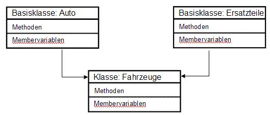 Ich habe ein Konzept aufgestellt, dieses habe ich in C++ umgesetzt. Wie kann man dieses Konzept besser grafisch darstellen? Wie macht man dies professioneller? Die Basisklasse Auto sowie Ersatzteile besitzen virtuelle Methoden die in der abgeleiteten Klasse Fahrzeuge ausprogrammiert (implementiert) werden.