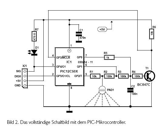 Der Mensch als Platte und eine auf einer Platinen-Kupferfläche aufgelötete Münze als Gegenpol bilden einen Kondensator (PAD in Bild 1). Grob (sehr grob) überschlagen: Bei einem Kupferstück von 3,2 cm2, einem Abstand von 4 mm (Acrylglasscheibe als Abstandshalter) und einer angenommenen relativen Dielektrizitätskonstante von 8 ergibt sich im Idealfall eine Kapazität von etwa 8 pF. Ohne Berührung sind es nur 2...3 pF. Über zwei Widerstände wird ein zweiter Kondensator (C2) geladen. Die drei Schalter sind in Wirklichkeit Ports eines Mikrocontrollers, wobei GP1/GP2 Signal A und GP0 Signal B repräsentieren. Die Messung besteht nun darin, über das Signal B die beiden Schalter für etwa 2 µs zu schließen. In dieser Zeit kann sich der Kondensator C1 über R1 fast vollständig aufladen. Ein wenig Ladung (in einer vernachlässigbaren Größenordnung) fließt auch über R2 nach Masse ab. Dann werden die beiden Schalter geöffnet und C1 kann C2 laden. Sobald C2 eine bestimmte Spannung (hier etwa 0,7 V) überschritten hat, ist der Vorgang beendet. Signal B schließt und C2 wird entladen. Nun kann der Zyklus von vorne beginnen. Die Anzahl der Wiederholungen, bis der zweite Kondensator voll ist, wird gezählt. So einfach ist das! Alleine die Tatsache, dass natürlich C2 gleichzeitig ge- und entladen wird, scheint auf den ersten Blick etwas widersprüchlich. Doch auch hier geht nur ein kleiner Teil der Ladung von C2 verloren, da die Schalter deutlich länger geöffnet sind als geschlossen. Der smarte Taster Im Idealfall werden ungefähr 20.000 Zyklen benötigt, um mit dem Finger des Anwenders C2 zu laden. Daher dauert eine Messung etwa 50 ms. Sobald die Software einen „Tastendruck” an GP3 erkannt hat, geht der Ausgang GP4 auf Masse und die LED leuchtet. Zusätzlich werden am Pin GP5 die Anzahl der Zyklen jeder Messung ausgegeben. Mit einem Oszilloskop oder einem Zähler kann man recht schön die Annäherung beobachten. Als Mikrocontroller wird - wie in Bild 2 zu sehen - ein preiswerter und leicht erhältlicher PIC12C508 mit 512 Byte Speicher verwendet. Wer noch einen 509er mit 1024 Byte besitzt, kann auch diesen Controller einsetzen. Der PIC arbeitet mit seinem internen RC-Oszillator bei etwa 4 PIC-Teletaster Schalten wie von Geisterhand ... Von Jürgen Wickenhäuser www.wickenhaeuser.com Statt mit einem Spezial-IC lässt sich ein kapazitiver Näherungsschalter auch mit einem preisgünstigen PIC realisieren. könnte der Controller den größten Teil der Zeit schlafend verbringe. Damit lässt sich die durchschnittliche Stromaufnahme problemlos auf 0,1 bis 0,2 mA senken! Auch durch HF dürfte der Taster nicht so leicht aus der Ruhe zu bringen sein, denn er variiert während der Messung die Geschwindigkeit des Signals A geringfügig (man kann ja nie wissen wer oder was stört)... (030214)rg