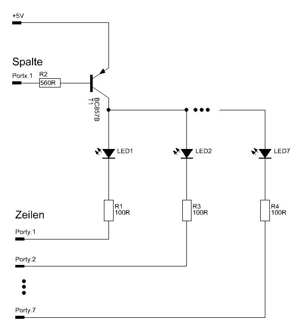 Danke für die Antworten. @Magnus Ich nehme einen Mega16. Gleichzeitig können ja nur 7 LEDs nach Masse geschaltet werden. Sollte doch eigentlich kein Problem sein. @Chrisi Ein Transistor schaltet nur eine Spalte. Ich habe nur beispielhaft eine Spalte gezeichnet, sind natürlich 5 insgesamt (5x7 Matrix). Der Mega läuft mit dem internen Oszillator mit 8 MHz. Ich habe einfach nur ein Testprogramm geschrieben, bei dem jede Spalte ein paar Milisekunden leuchtet und dann auf die nächste schaltet. Keine weiteren Aktivitäten des Prozessors. Egal wie hoch die Multiplexfrequenz ist, das Ergebnis ist immer gleich (gleich dunkel). Übrigens auch, wenn ich eine Spalte statisch anzeige. Als würde der Transistor nicht durchschalten. Gruß Olaf