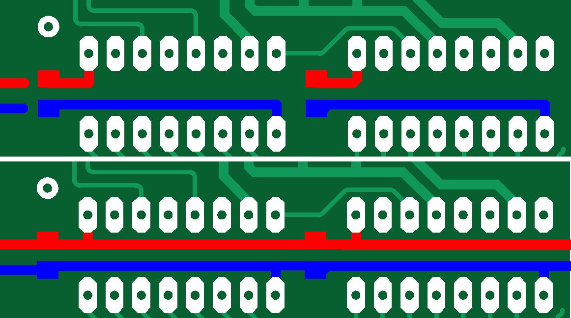 Solche Regeln muss man ja nicht immmer 100% strikt einhalten, vor allem nicht in langsamen oder gar statischen Designs. Aber wenn man sich konsequent an seine Regeln hält funktioniert auch das schnelle dynamische Design auf Anhieb. :-) Mein Vorschlag zu dem Problem ist angehängt. Sieht erstmal so aus, als wäre das auch nichts anderes. Ein paar mm Leiterbahn dürften mit TTL auch keinen Unterschied machen. Aber wenn es schnell wird ist es schon interessant, wohin die Impuls-Ströme fliessen. Aus dem gleichen Grund baut man um Quarze herum ja auch eine Masse-Insel mit nur einem Anschluss zum IC hin. Wie sehr sich das genau auswirkt? Bin ich nicht sicher, das würde ich gerne mal simulieren, dafür habe ich aber kein geeignetes Tool.