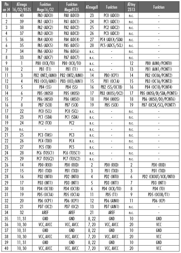 Im Anhang ist eine Tabelle mit der Beschaltung des Evalutionboard 2.0 von Pollin. Jeder Pin ist mit allen anderen in einer Zeile verbunden. Das Board bietet mehrere Sockel, unter anderem für ATMega8 und ATMega16/32. Kann ich zwei der genannten uCs gleichzeitig betreiben? Jeder uC hat einen eigenen Quarz. Bis jetzt habe ich das für sinnlos gehalten. Aber wenn es klappt, kann ich damit wunderbar mit der SPI rumspielen. Ich will aber nichts verbraten.