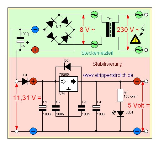 Wenn sich der Player an die USB-Specs hält, zieht er nicht mehr als 500mA und das auch nur nach vorheriger absprache mit dem PC/Hub. Die Schaltung oben sieht so schon mal ganz gesund aus. Man könnte allerdings noch eine Feinsicherung nebst Varistor und ggf. X2 Kondensator in den Netzeingang packen (Überspannungsschutz, Überlastschutz, Blindleistungskompensation). Den 7805er kann man für weniger Abwärme durch einen MC34063 ersetzen, Schaltung wie im Datenblatt. Der Chip hat wenn ich mich recht erinnere auch eine Art Überlastschutz on board. Oder aber man kauft sich für rund 10 Euro einen fertigen Adapter (langweilig). MfG Andreas