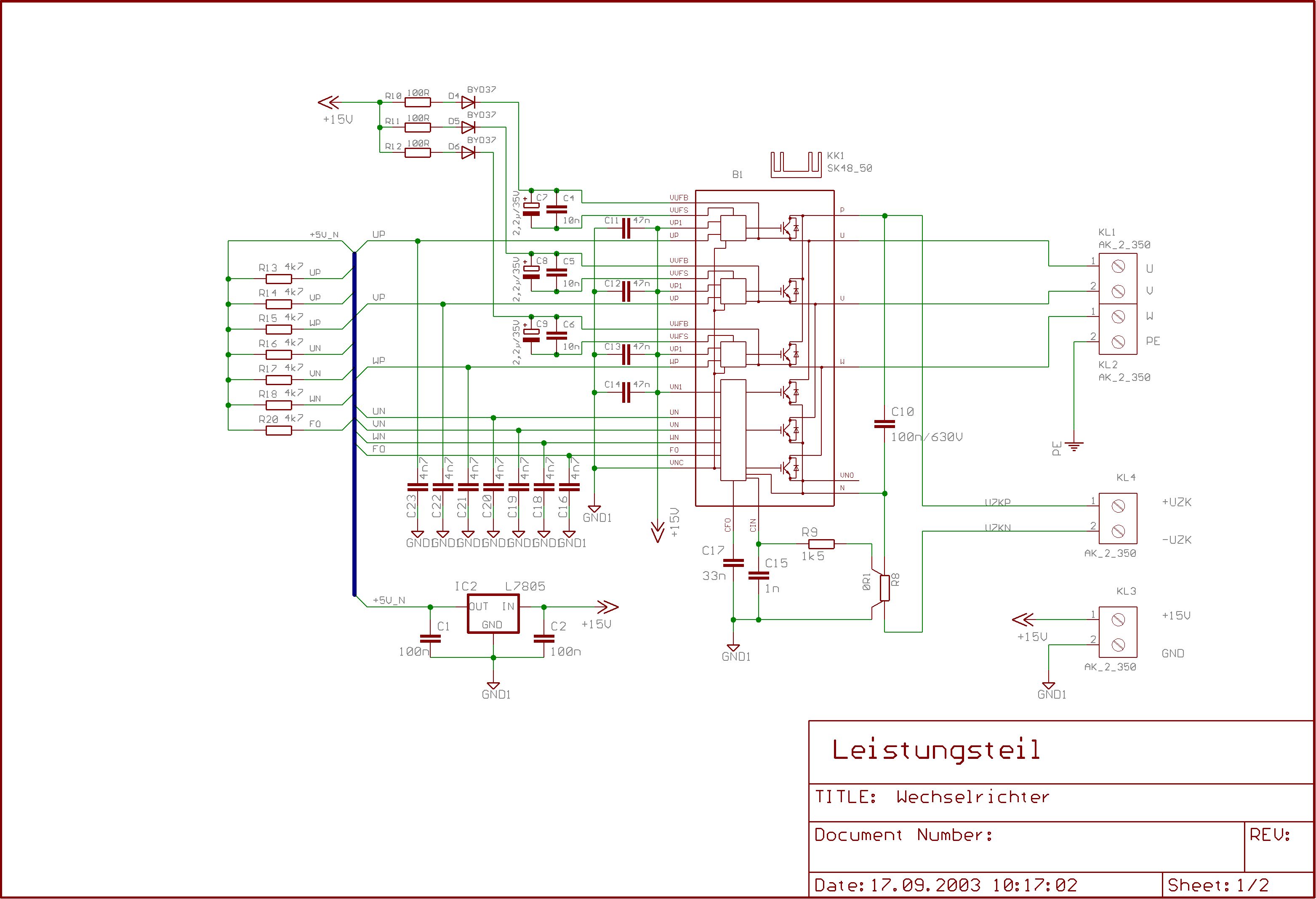 Hallo, Ich bin gerade dabei, mir einen 3-Phasen Wechselrichter für etwa 300W zu bauen. Die Schaltung für das Leistungsteil hänge ich mal dran. Die Ansteuerung werde ich mit einem M16C6N realisieren. Tschüß