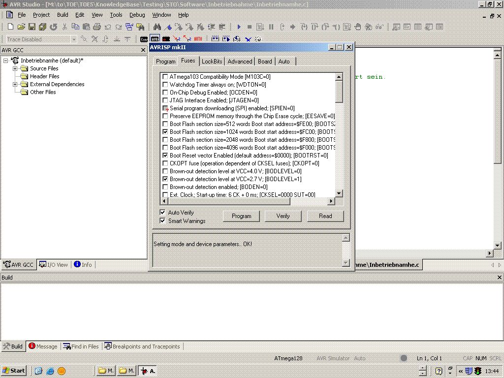 Hallo, erstmal danke für die Antworten. Ich benutze das "Avr Studio 4" und dort habe ich die Fuses wie im Anhang gesetzt. Zusätzlich habe ich noch einen externen Takt (Quarz) von 16MHz eingestellt. Muss ich noch irgendwas in meinem Programm das ich reinlade beachten?? Ich schreibe gerade mit C (vorgabe), muss ich da was beachten?? Gruß PS: Ich lese noch das Datenblatt, aber ich glaube das dauert noch bis ich mich durch die ganzen Abkürzungen durchgekämpft habe. Für einen Anfänger (zumindest mich) echt schwer?!?