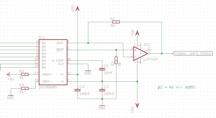Hier der gewünschte Schaltplan. Ersichtlich ist nur die Beschaltung des DAC0800. Problem bei dieser Schaltung ist nur die Spannungsversorgung, um einen Signalverlauf von 0-10V hinbekommt (Habe noch nicht getestet was passiert wenn V- auf GND gelegt wird). Es wäre kein Problem auch Spannungen von -5V - 5V zu erzeugen (ohne Offsetkompensation mit OPs). Dazu nutzt man andere Referenzspannungen.