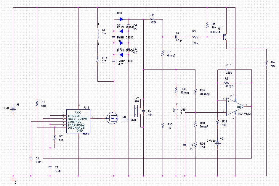 Dominik Friedrichs wrote: Kleines Update: > Einen Schlag habe ich mir auch noch nicht geholt ;) Inzwischen waren es 3 oder 4 glaub ich. Ist etwa halb so schlimm wie Netzspannung. Und 2 TLC555 sowie einen LM321 hab ich beim fuchteln mit der Hochspannung irgendwie gehimmelt. Ich hab die Schaltung inzwischen so weit optimiert, das sie nur noch 0.9mA zieht bei 9V und Leerlauf, mit 700meg-ohm Spannungsteiler für die Regelung, gleichzeitig aber im Regelbereich bleibt, wenn man ein 10Meg-ohm Multimeter anschließt um die Spannung einzustellen. Als Timer hab ich mich für den TS555 umentschieden, ist aber im Grunde der selbe, nur billiger. Op-Amp wird aber ein TLV2371 (Farnell), kleinere Input bias und offset current, vielleicht nicht schlecht bei 700meg Spannungsteiler ;) Aus dem Opamp hab ich ne Schmitt-Trigger Schaltung zur Regelung gebaut. Im Anhang noch ein Schaltplan der auch schon die Auswerteschaltung für das Zählrohr enthält (oben rechts, das Zählrohr kommt dahin wo jetzt R36 1G sitzt) U10 und R30 sollen in der Simulation den Anschluss eines Multimeters darstellen. Bei Fragen, fragen.