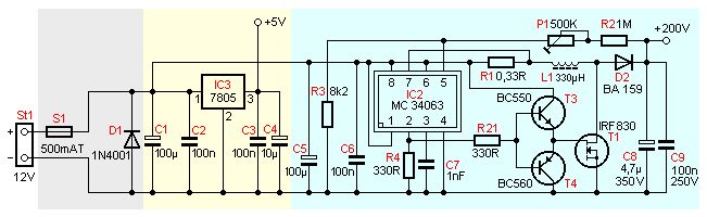 Hallo, Kleiner Tip, besorge dir beim örtlichen Elektrohändler ein kaputtes EVG (Elektronisches Vorschaltgerät für Leuchtstofflampen). Der ist froh wenn er das Los wird da man damit ja eh nix mehr anfangen kann und er die Dinger streng genommen in den Elektroschrott geben mußte. Da Drin findest du einen Passenden Mosfet der spielend 800V aushält (vorausgesetzt der ist noch ganz) und vor allen Dingen einen schönen vakuumvergossenen Ferrit-Transformator mit 2-Kammer-Wicklung. Der Trafo ist meistens noch ganz, normalerweise laufen bei den EVGs die Elkos aus durch die Wärmeentwicklung und killen durch den daraufhin folgenden Isolierschichtdurchschlag die eingebaute Sicherung. Es sind teilweise noch mehr interessante Teile drinnen, bei den guten EVGs sogar ein komplettes Netzfilter auf 2-Kammer Ferrittrafo den man bei bedarf leicht Umwickeln kann. Die Zündspannung einer Leuchtröhre kann je nach zustand ohne Probleme 2000Volt betragen, diese wird ebenfalls von dem Transformator erzeugt. Zündet die Röhre bricht die Spannung zusammen da die Röhre Strom zieht. Das Regler-IC merkt das und nimmt dann auch den Duty-Cycle des Schaltwandlers zurück. Der Trafo hat sogar nen VDE-Zeichen drauf, also was willst du mehr? ;-) MfG Roland