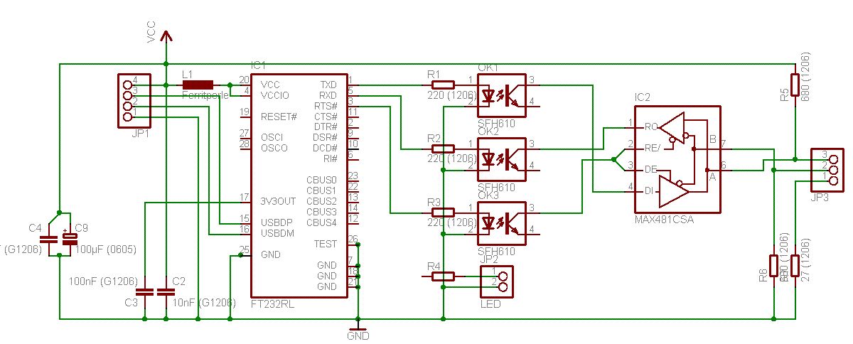 CBUS0+1 solltest du nicht verbinden, da es keine OpenCollector Ausgänge sind. Entweder du schliesst 2 separate LEDs and (mit 2 Widerständen a 390R) oder nur eine an CBUS0 und programmierst diesen mit MPROG auf RX&TXLED um. Normalerweise macht man eine galvanische Trennung um den teuren PC vor den bösen angeschlossen Geräten zu schützen. Wenn es die wirklich darum geht die teuren DMX-Geräte vorm bösen PC zu schützen kannst du die Optokoppler weglassen. Ein PC wird an seinem USB Anschluss wohl kaum eine zerstörerisch hohe Spannung ausgeben. Gruss Andi