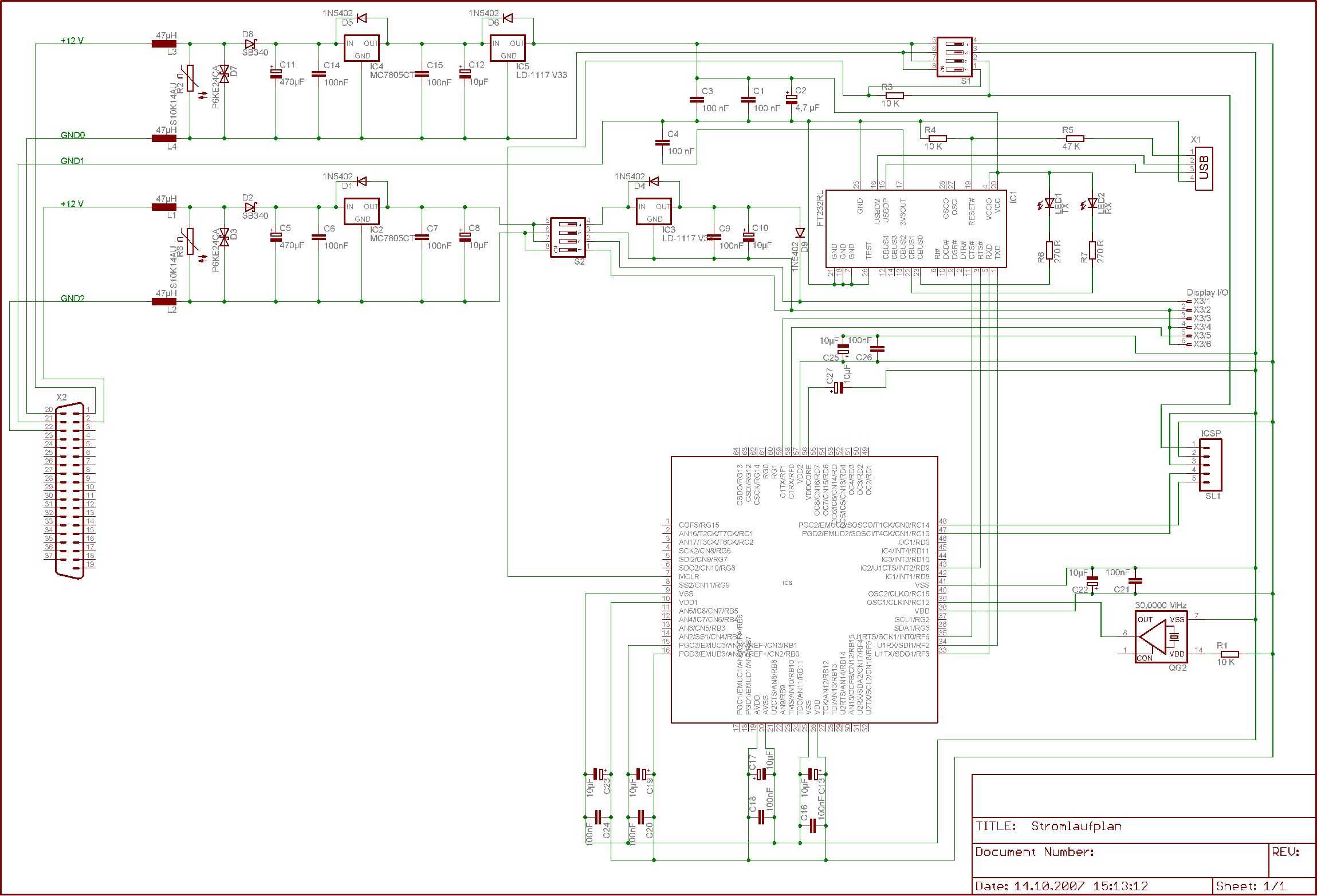 So habe gerade die Grundschaltung für meinen PIC ohne auf feinheiten zu achten fertig gestellt. Da ich bei der Erstellung der Stromversorgung und beim Anschluß des FT hilfe hier aus dem Forum hatte (die mich sehr weiter gebracht hat) dachte ich ich stell die Schaltung mal hier ein. Vielleicht kann ja mal einer drüber schaun und es hat vielleicht auch jemand verbesserungs vorschläge (für die ich immer offen bin), oder findet vielleicht auch noch einen Fehler den ich übersehn habe. Die Schaltung soll mal in meinem Auto laufen und ein Grafik Display steuern, auf dem mehre Werte erscheinen sollen wie: Öl Temperatur, Öl Druck, Lade Druck, Bordspannung, Drehzahl, Wassertemperatur, spielerein wie GPS Koordinaten (je nach realisierbarkeit) und einiges mehr. Die beschaltung dieser Funktionen ist jedoch bis jetzt noch nicht in der Schaltung vorhanden. Da ich die im Fahrzeug vorhandenen Sensoren weitestgehend benutzen möchte, (jedoch ohne aus Sicherheitsgründen den ganzen Kabelbaum aufzutrennen) Auserdem soll das ganze auch durch Optokopler komplett von der Fahrzeugelektrik getrennt erfolgen. Aber das wird wohl noch ne weile dauern. (Fehlen noch die Ideen) Wäre schon mal froh wenn mir jemand sagen könnte das die Schaltung so wie sie jetzt ist erstmal funktionieren könnte. Vielen Dank im voraus. Gruß Mathias.