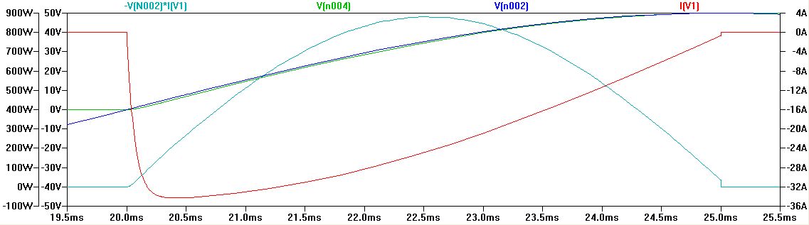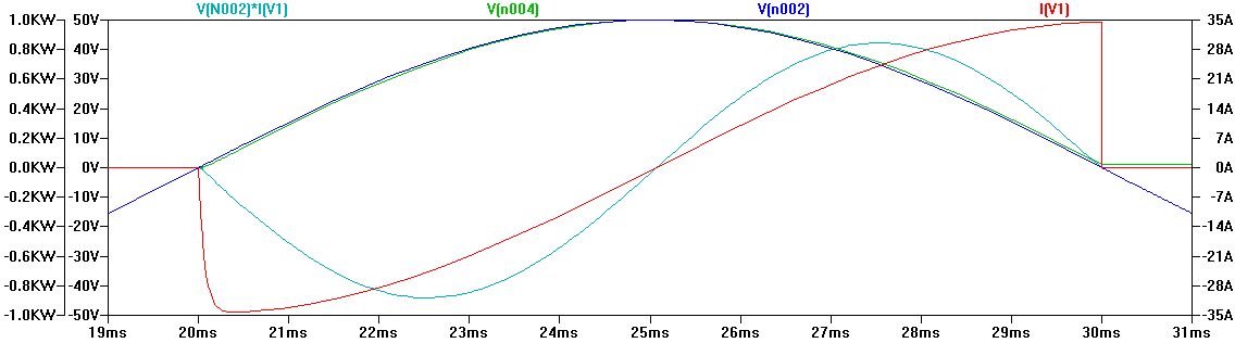 "Das führt dann zB. zu Effekten wie das der Stromfluss beim Amplitudenmaximum auf 0 zurückgeht, und wenn die Amplitude 0 ist (also beide Leitungen auf gleichem Potenzial liegen) auf einmal der Stromfluss maximal wird." Ich will da jetzt nicht auf jedes Wort einzeln eingehen, aber ist es nicht so, dass, um den Kondensator zu laden, eine Spannung anliegen muss? Wie sollte man ihn sonst auf eine bestimmte Spannung aufladen? Im gleichen Moment muss außerdem ein Strom fließen, sonst steigt die Spannung ja nicht weiter. Hier wird also "echte" (Wirk-)Leistung aus dem Netz entnommen. Ich hab mal was aus einer Simulation angehangen. Blau ist die Netzspannung, Grün ist die Spannung am Kondensator, der für eine Viertelwelle über einen Schalter an's Netz gehangen wird. Rot ist der fließenden Strom. Das türkise ist das was der Stromzähler misst, nämlich Strom mal Spannung, besser bekannt als Leistung. Wenn der Kondensator nach dieser Viertelwelle weiter am Netz hängen würde, würde er die aufgenommene Leistung in dieser wieder in's Netz zurückspeisen. Wenn man ihn weiter am Netz hängen lässt würde er in der dritten Viertelwelle wieder Energie aufnehmen und selbige in der vierten Viertelwelle wieder abgeben. Die Leistung würde hin- und her pendeln, das würde man dann Blindleistung nennen. Das ist hier aber überhaupt nicht der Fall, da zwischendurch rumgeschaltet wird. Der Zähler wird diese Blindleistung nicht messen, da sie dann als Wechselleistung anliegt, dadurch würde die Aluscheibe nur etwas hin- und her rütteln. Merke: Wenn da irgendwie geschaltet wird, kommt man auch mit komplexer Wechselstromrechnung nicht weit.