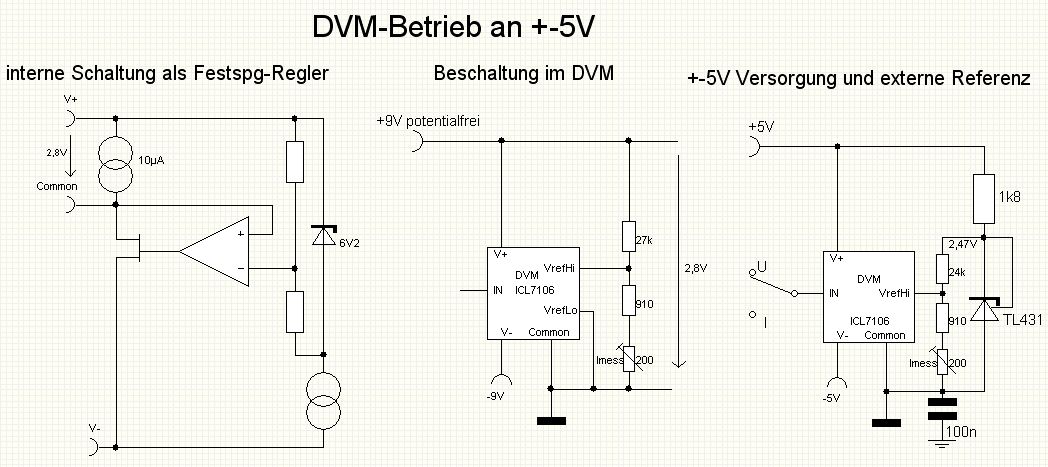 Ich betreibe die DVMs potentialgebunden mit einem kleinen Schaltungstrick. Dazu muss man sich etwas mit den Innereien der typisch verwendeten ICL7106 beschäftigen. Der ICL7106 arbeitet zwischen V+ und Common wie ein neg. Festspannungsregler. Er zieht also Strom an Common bis ca. 2,8V zwischen V+ und Common stehen (siehe Bild 1). Daraus wird in den DVMs die Referenz abgeleitet (siehe Bild 2). Wenn man jetzt zwischen V+ und Common z.B. 5V legt, hat man den Spannungsregler tot gelegt. Er kann keinen Strom mehr ziehen und es gibt keine Referenz mehr. Wenn man jetzt extern die Referenz anlegt, läuft alles bestens. Das sieht dann aus wie im Bild 3. Damit wieder der Messbereich auf 200mV kommt, muss man den 27k auf 24k ändern und am Trimmer wieder genau auf 200mv abgleichen. So betreibe ich die DVMs in jeder beliebigen Schaltung ohne potentialfreie Versorgung (max 15V). Die Referenz und damit den Messbereich kann man mit dem Spannungsteiler in weiten Bereichen anpassen. So muss man z.B. für eine Strommessung in einem Netzgerät nicht umständlich den Shunt auf einen genauen Wert trimmen.
