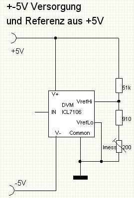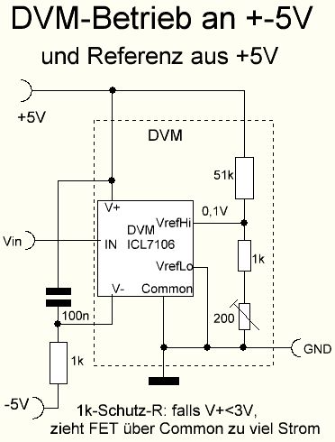 Es ist zwar lange her, aber mein Beitrag wird wohl ab und zu nochmal gelesen. Mir sind inzwischen 2 DVM mit der angegebenen +-5V-Versorgung gestorben. Der Grund ist vermutlich folgender: beim Ein/Aus-Schalten kann es passieren, dass die -Spg früher kommt als die +Spg. Ist jetzt V+ noch <3V, zieht der interne Spg-Regler zu viel Stom und stirbt. Deshalb sehe ich jetzt immer einen 1k-Schutzwiderstand in der V- Leitung zur Strombegrenzung vor. Seitdem habe ich noch keinen weiteren Ausfall gehabt. Damit euch das beim Nachbau nicht auch passiert...