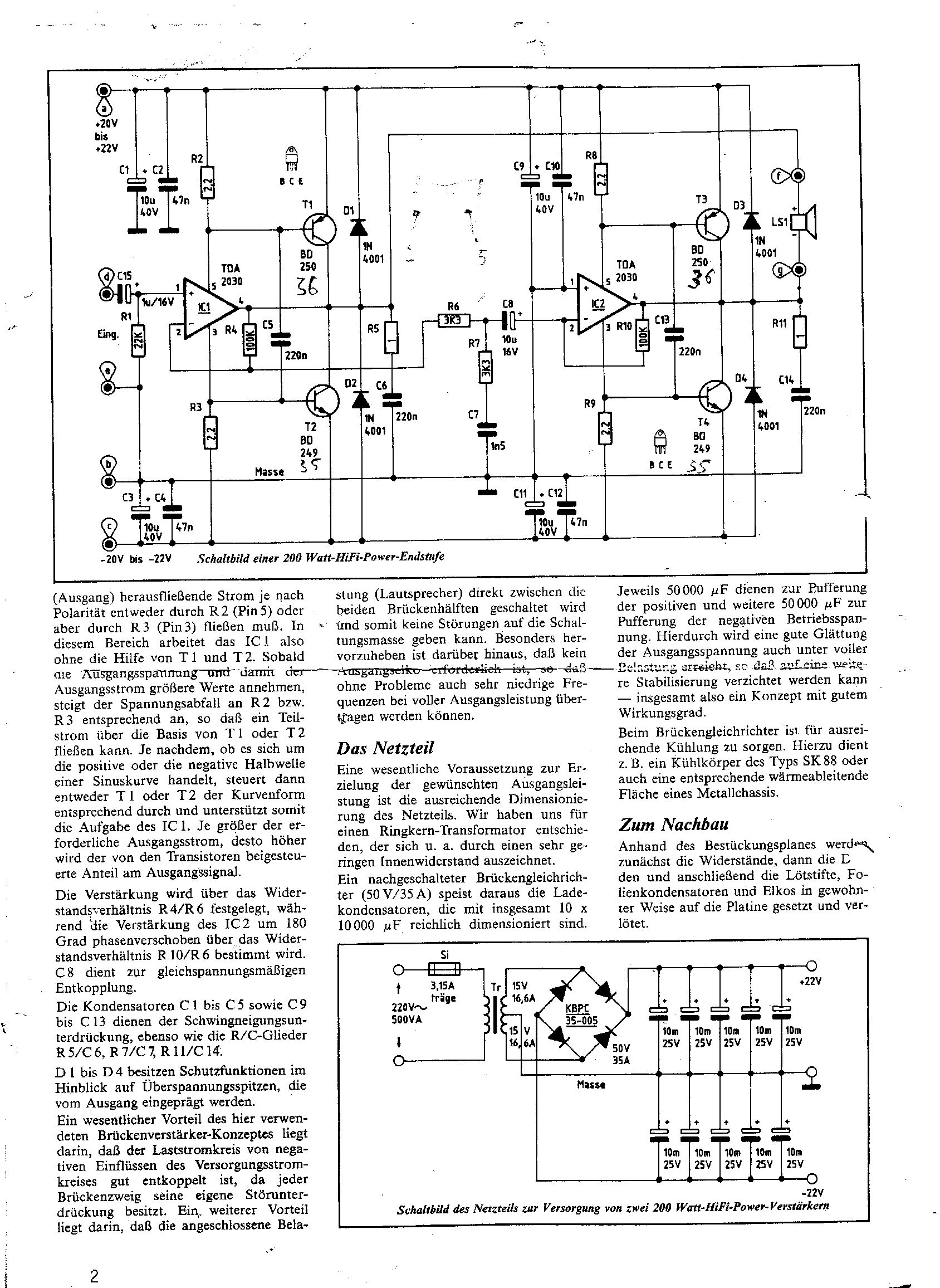 hallo hab auch mal so was gebaut mit 2 mal 200 watt und 4 tda 2030 die 44 volt vertragen. hab da ein geregeltes netzteil dafür gebaut. da schwankt die spannung zwischen leerlauf und vollast nur um 1 volt. es sind so um die 42 volt drauf.(je nach temp) der amp. zieht voll durch. egal ob leerlauf oder vollgas . habe das teil auch schon öfters mal abrauchen lassen. man darf auf keinen fall die 4 ohm unterschreiten. die stomspitzen sind zu hoch. hf schwingungen hatte ich erst auch. der zog extrem strom ohne eingangssignal. lösung ist ganz einfach.... einfach einen kondensator parallel zum eingang rann. dann ist ruhe. nur aufpassen das die höhen nicht zu sehr leiden.aus probieren.