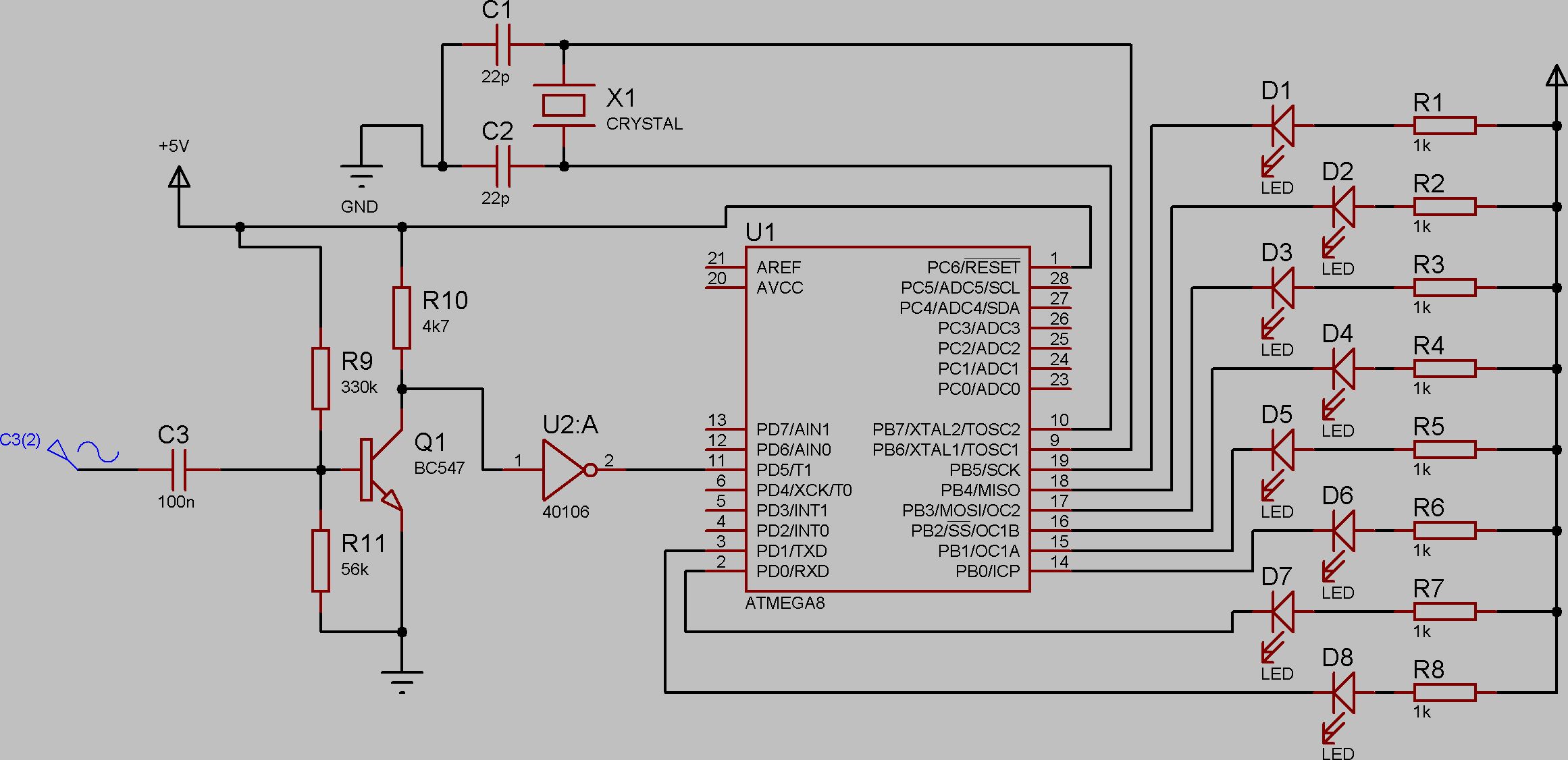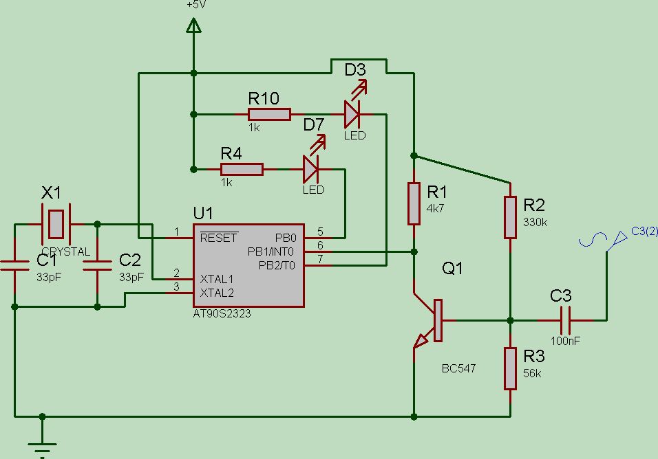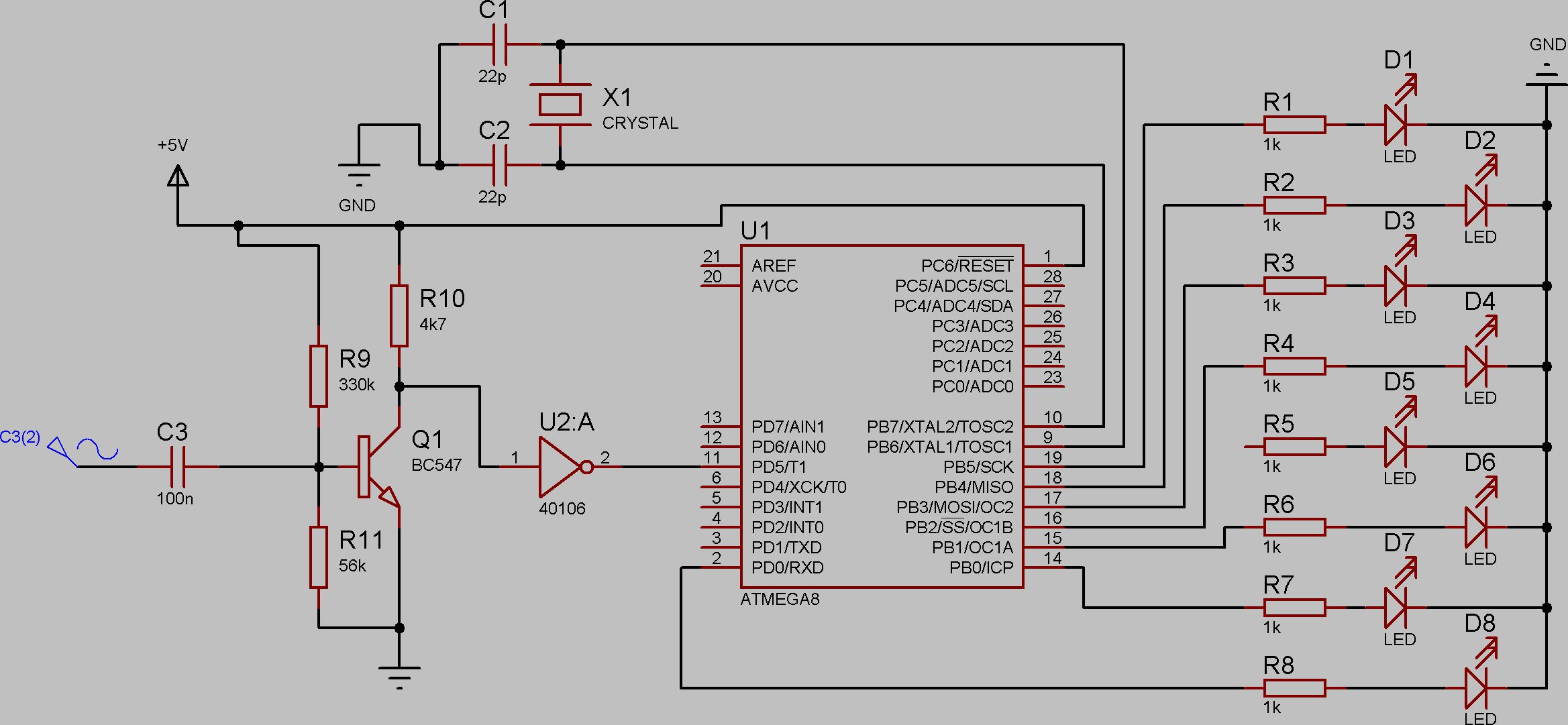 Ich will mit einem Mikrophon den Ton aufnehmen. diese (sinus?)-Kurve soll dann verstärkt werden und in ein rechtecksignal umgewandelt werden. Edit: Hab Dich beim ersten mal nicht ganz verstanden... Also ich wage jetzt mal zu bezweifeln, dass das so was wird... und Du hast Deine LEDs high-aktiv an die Ausgaenge geschalten was eigentlich davon zeugt dass Du das Tutorial nicht sehr genau durchgelesen hast. Dann was mir noch so spontan auffaelt: RESET direkt auf High ohne Pullup... wenn das mal nicht Bumm macht beim Einschalten... Dann willste was Digitalisieren, hast das Signal aber nicht an einem AD-Pin angeschlossen und VREF ist ebenfalls nicht angeschlossen... Wie soll die Simulation eigentlich ohne Programm fuer den ATmega funktionieren? Und wozu sind die ganzen LEDs? Michael