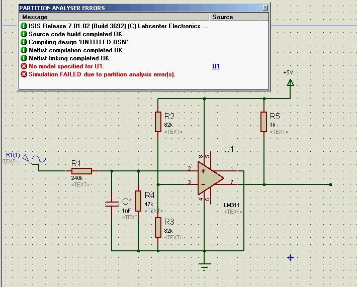 danke für die antworten bisher. ich habe aber grad ein neues Problem: wie vorgeschlagen habe ich nun überlegt, das mit dem LM311 - Komparator umzusetzen. aber wenn ich den in Proteus einbaue, dann bekomme ich immer eine Fehlermeldung (siehe Anhang) kann mir da jemand helfen? (das wird sicher nur ein kleines Problem sein, aber weder google, noch die hilfe des Programmes hilft mir...) Hannes