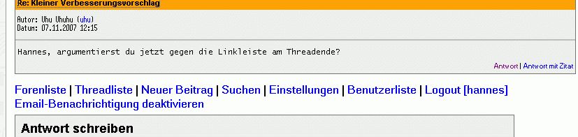 Im Kopf jedes Threads steht zu allererst ein Link auf das Forum, in dem er steht. In der dritten Zeile steht die Linkleiste Forenliste | ... Man kann von dort den passenden Link anklicken, wenn man nicht die Zurück-Funktion des Browsers benutzen will. Die letzte Zeile des Threads ist wieder die Kink-Leiste von Zeile 3. Wenn man nun einen Beitrag geschrieben hat - womöglich in einen schon sehr langen Thread - dann befindet man sich am Ende des Textes. Will man nun zurück ins Forum und nicht in die Forenliste, dann ist die Zurück-Funktion des Browsers um so unbequemer, je öfter man die Vorschau benutzt hat, denn man muß ja alles durchblättern. Die Alternative ist, an den Thread-Anfang zurückzukehren und den Forum-Link anklicken. Bequemer wäre es allerdings, wenn der Forenlink ebenfalls am Threadende wiederholt würde.