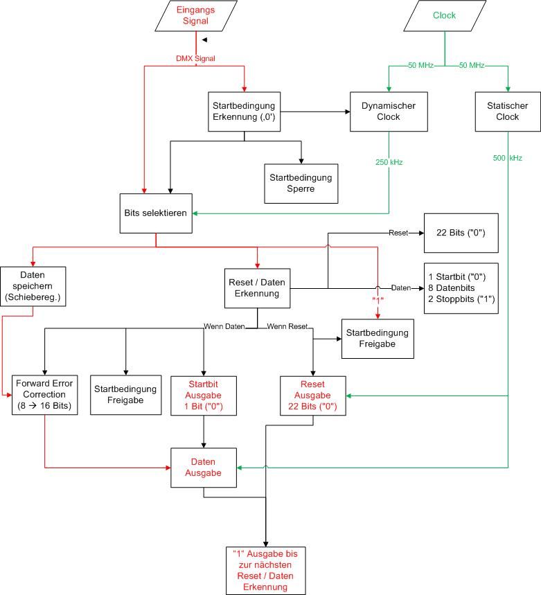 also...ein dmx signal kommt am eingang herein (seriell mit 250kHz) --> sende seite dieser fügt via hamming code redundantbits hinzu...--> paar leichte berechnungen --> ausgabe von fpga mit 500 Khz danach wird dieses Signal über eine funkstrecke am 2 fpga eingelesen (eingang 500kHz) er macht fehlererkennung usw...und anschließend schickt er das signal ohne redundanz wieder mit 250 Khz weiter