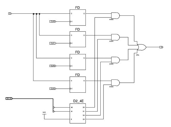 Hallo! Ich möchte mit einem Virtex-2 von Xilinx auf mehreren Ausgängen Impulse erzeugen, deren Startzeit mit einer Auflösung von einem viertel Takt angegeben werden soll. Beispiel: Bei einem Systemtakt von 100 MHz (Periode 10 ns) möchte ich auf dem ersten Kanal einen Impuls nach 20 ns und auf einem zweiten Kanal nach 22.5 ns erzeugen. (die Zeiten sind wählbar) Meine Lösung sieht bisher so aus: Ein DCM erzeugt aus den 100 MHz vier Takte (0°, 90°, 180° und 270° Phasenverschiebung). Pro Ausgangskanal habe ich eine Schaltung aus vier FlipFlops (siehe Anhang). Wobei jedes FlipFlop einen anderen Takt bekommt. Die Dateneingänge bekommen alle das gleiche Signal. Per Multiplexer (der Rest im Bild im Anhang) wähle ich ganz zu Beginn ein bestimmtes FlipFlop aus. Also z.B. bei 22.5 ns das FlipFlop, das den 90°-Takt bekommt. Wenn der Impuls dann schließlich kommen soll (ein Counter zählt nebenbei mit) gehen die Dateneingänge der FlipFlops auf High. Jedes der vier FlipFlops übernimmt zu seinem Takt und nur das gewünschte Signal kommt durch den Multiplexer. In der Theorie funktioniert das auch soweit :) In der Praxis reicht je nach Synthese-Ergebnis die Setup-Time von 2.5 ns nicht aus. Also bei steigender Flanke des Systemtakts (0°) setze ich die Dateneingänge und das FlipFlop übernimmt nach 2.5 ns (90°) nicht. Meine Fragen sind nun: Kann man da mit Timing-Constraints was machen? Und wenn ja, wie würde das konkret aussehen? Oder hat jemand vielleicht eine völlig andere Idee? Entschuldigt diese ewig lange Ausführung. Ich wollte möglichst detailiert beschreiben, um was es geht. Viele Grüße, Andreas
