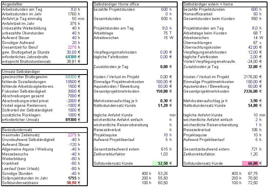 Update für einen Ingenieur mit weniger Erfahrung und noch guten Vergleichsgehalt, einmal für Home Office und einmal für ein Projekt in München. Den Satz fürs home office kriegt man noch (45,- bis 50,- für einfache Software ist leicht machbar) aber in München kostendeckend zu arbeiten, erforderte auch bei langen und damit effizienten Projekten einen Stundensatz, den praktisch keiner zahlt.