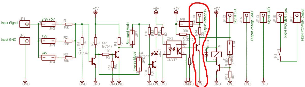Jo, ein Transitor mehr und vier zusätzliche Widerstände und im Eingangsbereich braucht es keine Jumper mehr und das Eingangssignal kann bis 60 Volt gehen. Zusätzlich wäre dann der Strom in den Eingang unabhängig von der angelegten Spannung... Und nochmals ein Widerstand mehr und der Eingang hätte sogar Hysterese... Ansonsten verschwendet ihr im Eingangsteil viel zu viel Strom... Kleiner Tip: Es gibt nicht nur die Emitterschaltung. Kollektorschaltung und Basisschaltung sind auch schon erfunden...