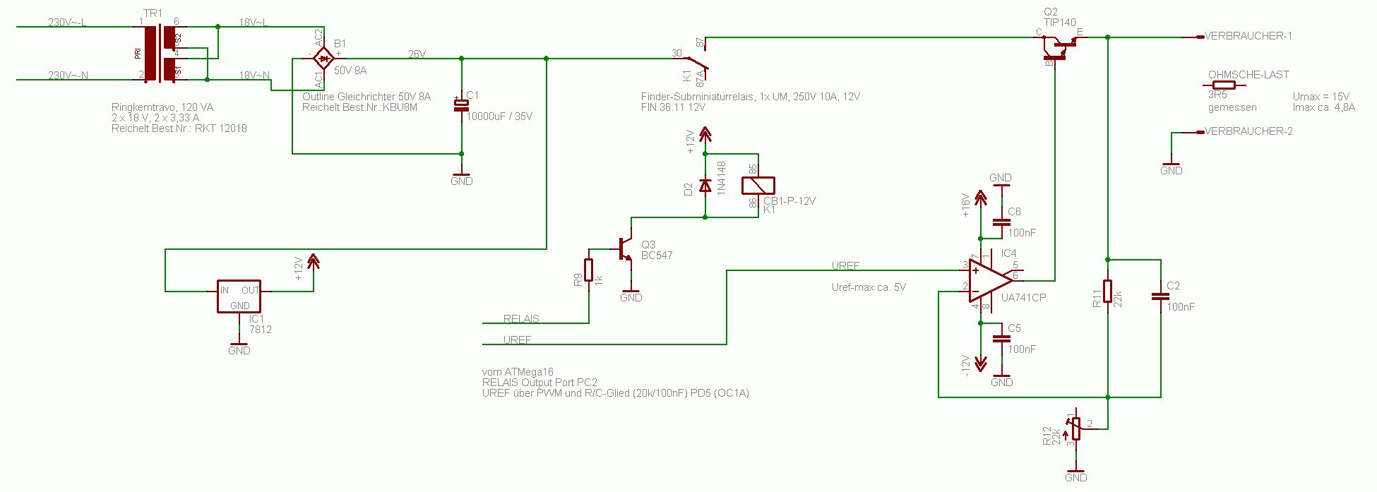 Hallo, ich bin dabei für einen rein ohmschen Verbraucher eine Steuerung über PC (RS232) zu bauen. Dazu habe ich einen ATMega16 mit PWM verwendet. Das erzeugte PWM Signal wird über ein R/C Glied in eine Gleichspannung gewandelt. Diese dient als Referenzspannung für einen ganz einfachen Regelkreis (siehe Schaltung im Anhang) aus uA741CP und TIP140 (die Bauteile hatte ich noch liegen). So kann ich per RS232 Befehle die Ausgangsspannung von 0V bis max. 15V einstellen. Der maximale Strom ergibt sich dann aus den Daten des Verbrauchers. Im Leerlauf funktioniert das alles auch sehr schön. Wenn ich aber meine Heizplatte anschließe, fängt das ganze scheinbar an zu schwingen. Ich messe über dem Verbraucher jedenfalls keine saubere Gleichspannung. Der ATMega16 wird aus einem separatem Trafo versorgt, ebenso die Versorgungsspannungen des OP. Verbunden ist nur GND. Wie kann ich die Schaltung modifizieren, damit ich eine saubere Ausgangsspannung bekommen? Gibt es an der Schaltung noch weiteres zu Verbessern?