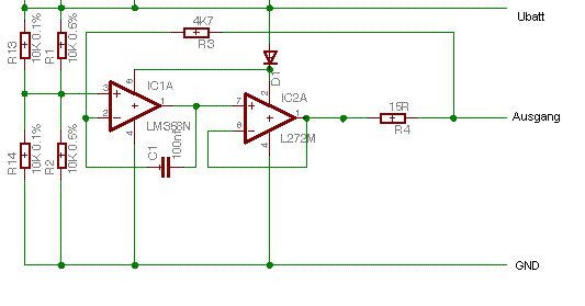 Danke für die vielen Antworten. Klar hat Stefan recht. Das hab ich ja auch schon im ersten Post geschrieben. "Die OPVs erzeugen am Ausgang eine Spannung, die der Referenzspannung entspricht" oder einfacher Ubat / 2 IC2A ist da um den Ausgang zu treiben, der kann nämlich 1A. Ich kauf euch die Nummer mit dem "C1 ist da, damit die Schaltung nicht schwingt einfach mal ab". Es war zwar schon ne Vermutung von mir, aber richtig vorstellen kann ich mir nicht wie der C1 da helfen kann.