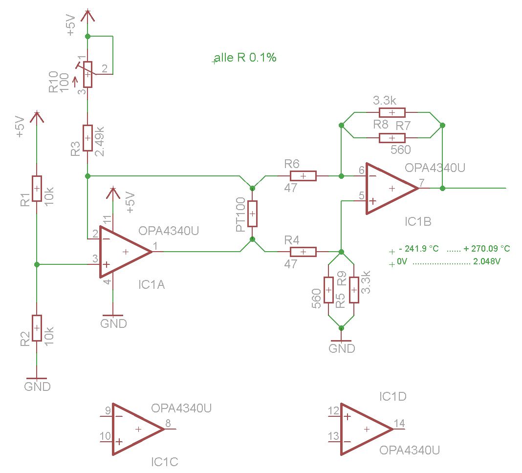 Öhem, nö da kann ich so nicht mitgehen weil: @helmi 1. keine Vierleiterschaltung 2. zu hohe eigenerwärmung (gerade bei Lufttemp. !) wegen 5mA 3. puste mal deine elektronik an und du wirst dich wundern ... (offset voltage drift) 4. warum denn rail zu rail ??? ... 5. ick halt jetzt meine klappe und wünsche noch viel erfolg
