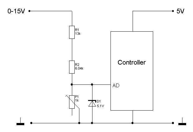 Auch wenn dieser Thread schon hundealt ist, aber ist eigentlich noch niemandem aufgefallen(?????), dass in der wunderhübschen Zeichnung von Ratber ein kleiner Fehler ist... ums kurz zu machen...ich würde die Spannung ehr zwischen R1&R2 messen, nicht zwischen R2&P1 soll mir ja 15V auf 5v teilen, net wahr...? nicht das es mal jemand nachbaut und sich dann wundert wenn 0,75 statt erwarteten 5V rauskommen! :) Gruß Jan