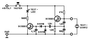 Wenn du nur den Quarz testen möchtest und nicht ob er in einer bestimmten Schaltung anfängt zu schwingen, kannst du mal die Schaltung testen, die ich im Anhang gepostet habe. Ich habe diesen Tester auch schon aufgebaut und auch schon Quarze bis 13Mhz getestet.