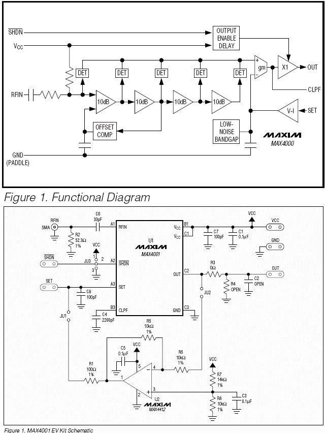 Hallo! Ich möchte den MAX4000 als HF-Detektor verwenden. Also am OUT-Anschluss eine Spannung haben, die der Eingangsleistung an RFIN entspricht. Reicht es dafür OUT und SET direkt zu verbinden? Ich verstehe nicht warum sich beim EVKIT zwischen OUT und SET ein Inverter befindet (Im Detektor-Modus sollen JU1 + JU2 gebrückt sein). Im Anhang sind MAX4000 Funktionsdiagramm und EVKIT-Schaltplan. Über ein paar Hinweise würde ich mich freuen. Michel