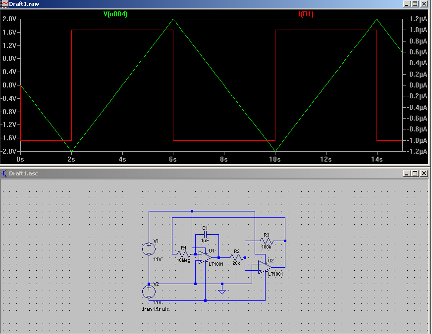 @ Intenso B. (intenso) Du hast vermutlich in dem Screenshot.png die Zuordung der Kurven verwechselt. Bei t=2s, 6s, 10s ... schaltet der zweite OP von +10V auf -10V um (und umgekehrt) und damit wechselt der Strom durch R1 (rote Kurve, Rechteck) die Richtung. Die Amplitude des Stromes ist in meinem Bild aber nur 1µA! Die grüne Kurve (Dreieck) ist die Ausgangsspannung des Integrators U1 mit der Amplitude 2V.