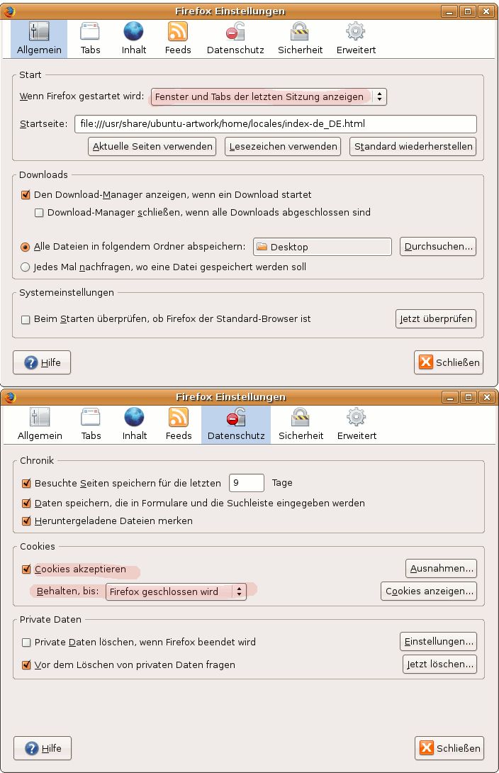 >FF gaukelt einem vor, die Cookies am Sitzungsende zu vernichten und hebt >stattdessen sogar Sitzungscookies ad infinitum auf Aber nicht generell, sondern nur, wenn man die Sitzung wiederherstellen lässt bzw. weiterführt. Oder hab' ich auch das falsch verstanden? >Aber dazu muß man diese wirklich abenteuerliche Macke von FF >aber erst mal kennen. Was heisst da 'Macke'. Laut diesem hier ist das exakt so beabsichtigt: http://wiki.mozilla.org/Session_Restore#Data_to_be_saved Und wenn man die Sitzungswiederherstellung auch so betrachtet, dass man exakt da weitermachen kann, wo man aufgehört hat, ist das Speichern von Cookies auch sinnvoll, solange, bis die Sitzung beendet wurde. Sitzungskekse werden zum Ende der Sitzung gelöscht, eine gespeicherte Sitzung ist keine beendete Sitzung. Wobei die sich offensichtlich selbst Gedanken über dieses Problem machen: "Storing cookies: Is it okay to persist cookies that are supposed to expire when the session ends? What about SSL cookies?"
