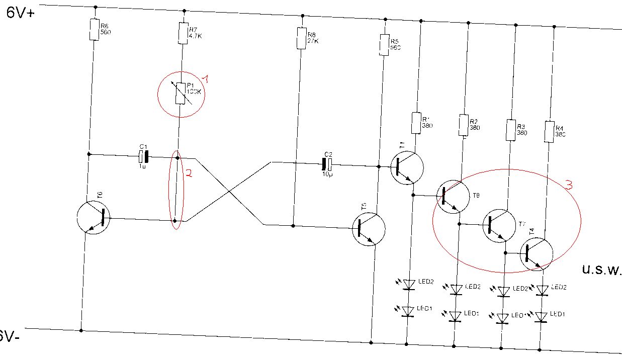 Besten dank erstmal für die Tipps. 1. Habe ich auch ungefähr verstanden außer dieses eine Post von crazy horse: "Nimm einfach EINEN n-Mosfet, Gate an R5/T5, Source an Masse, in den Drainkreis jeweils 7 Gruppen aus 2LED+passenden Widerstand." Was zum Teufel ist ein n-Mosfet, wo bekomme ich eines her, Was ist Gate, was ist Source, was ist ein Drainkreis... was 7 Gruppen mit 2LEDs+R sind weiss ich glücklicherweise. 2. Da ich leider grade weder nen 555 noch so einen n-Mosfet da habe würde mich interessieren, ob auch mit meinen BC546 so etwas möglich ist? Die Schaltung blinkt ja schon, allerdings nur mit 2 LEDs und nicht mit mehr. 3. Setze ich nun die Spannung auf 9Volt hoch, auch schon mit 4 LEDs, ich brauche aber 14. Muss ich außer den LEDs+Rs auf der rechten Seite noch weiter Widerstände (R5,6,7 oder R8) verändern?
