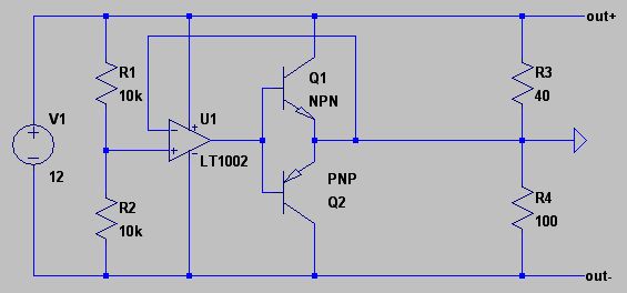 > Kann die Schaltung so funktionieren? Nein. Die 2.5k für GND sind viel zu wenig belastbar. > Statt die virtuelle Masse nur mit einem Spannungsteiler zu machen, > kannst du dies mit einem nachgeschalteten Spannungsfolger tun Aber nicht mit dem gezeigten Schaltplan. Die "Totzone" des NPN/PNP Emitterfolgers von 1.4V führt zu wilden Schwingungen. Ich weiß nicht, ob es darauf ankommt, exakt 5V zu haben, oder ob die 12V so versaut sind, daß man einen weiteren Regler als Filter haben will, aber für die Aufteilung der ausreichend hohen Gesamtspannung auf 2 Teilspannungen mit virtueller Masse tut es ein Spannungsteiler mit OpAmp, aber bitte richtig: http://www.dse-faq.elektronik-kompendium.de/dse-faq.htm#F.9.2 Wenn man genau 5V/-5V haben will, dann eben mit EINEM vorgeschalteten 10V LowDrop Regler.