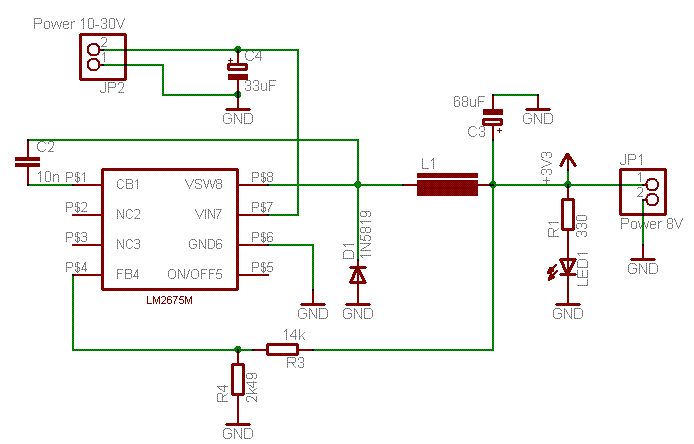 Hallo Hier der Schaltplan aus Eagle. Eingangsspannung soll bei einer Anwendung 12V und bei einer Anwendung 24V sein. Bauteile sind: LM2675M-ADJ Diode 1N5819 Drossel L1 Fastron L-PISR 150uH C2 Standard C 10nF C3 Low-ESR ELKO 35V 68uF C4 Low-ESR ELKO 35V 33uF R3 Metallschicht 14kOhm R4 Metallschicht 2,49kOhm Danke für Eure Hilfe!
